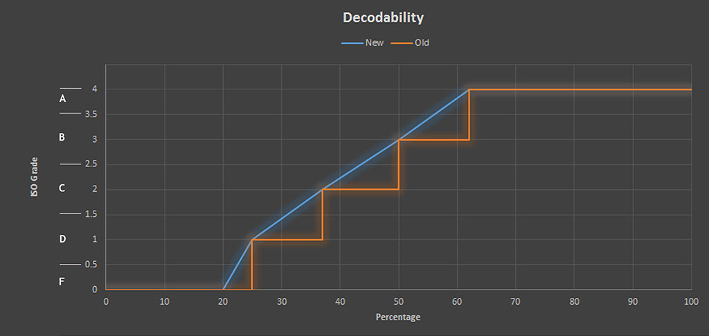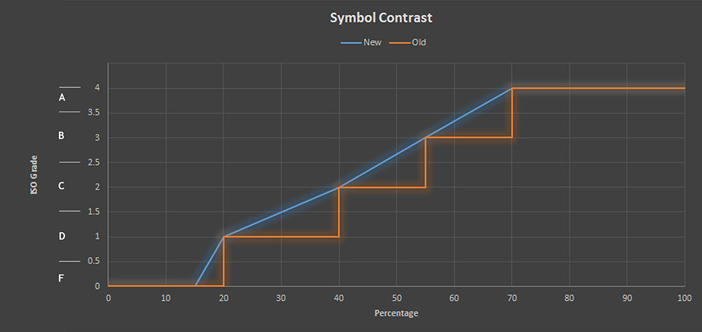 The 2016 version of the standard recognises that a symbol like this should have a better grade than an otherwise similar symbol where the symbol contrast value was consistently, say, 55% to 57%. So now the conversion of percentages to grade values is now done with 41 bands rather than only 5, and this means that barcodes will generally have slightly better grades than they did before. It means that small changes in parameter values at the transition points between grades will not cause such a large change in the grade.