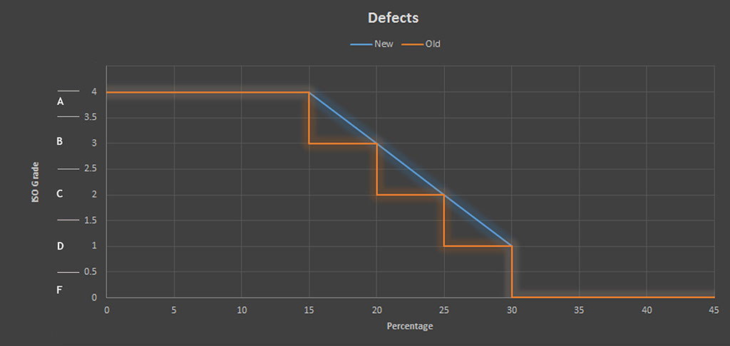The new version of the standard has also introduced a new way of measuring defects – the white marks that sometimes appear in dark bars, and dark marks that affect the background. It has been recognised that the original method for calculating the defect value and grade was unfairly stringent if the defect was located near to the edge of a bar/space transition and was only a minor defect. A revised method of calculating defect values has therefore been developed for the new version of the standard that is intended to be a more realistic indicator of the significance of the defect to the anticipated scanning performance of the barcode.