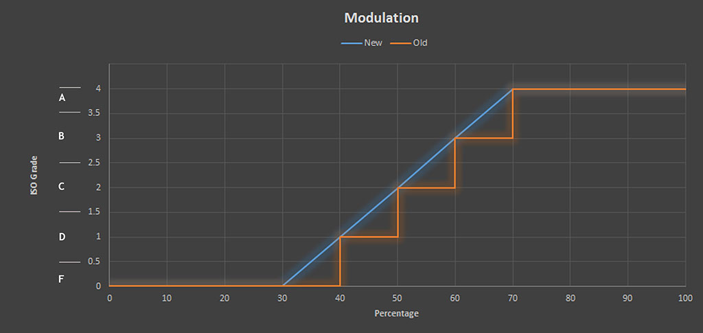The 2016 version of the standard recognises that a symbol like this should have a better grade than an otherwise similar symbol where the symbol contrast value was consistently, say, 55% to 57%. So now the conversion of percentages to grade values is now done with 41 bands rather than only 5, and this means that barcodes will generally have slightly better grades than they did before. It means that small changes in parameter values at the transition points between grades will not cause such a large change in the grade.